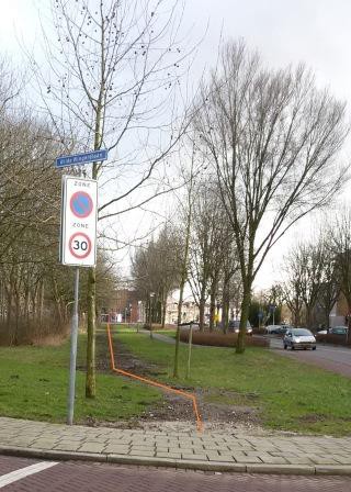 Nu zijn er een paar maanden geleden ‘ ondergrondse’ werkzaamheden geweest (riool, kabels en leidingen) waardoor precies in het midden, over de volle lengte van deze brede groenstrook de grond open moest. En na afloop van de werkzaamheden moest deze sleuf natuurlijk weer worden dicht gemaakt.