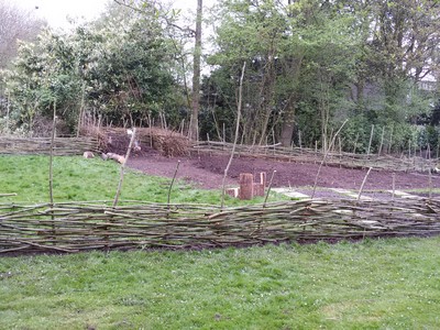 In het kader van ‘Groen moet je doen’ hebben bewoners in de Hoevenbuurt, in de wijk Bloemendaal, samen met Cyclus (verantwoordelijk voor het groenonderhoud in Gouda) een stuk grond vol met braamwortels omgespit. Ook leerlingen van de basisschool ’t Vlot hebben meegeholpen. Door Promen zijn wilgentenen aangeleverd waarmee een omheining is gevlochten. Meer informatie geeft het berichtje niet prijs en ook een foto ontbrak dus ik wist eerst niet wat er nu precies was gebeurd. Vandaar dat ik zelf ben gaan kijken, zodat ik wat foto’s kon maken. Het blijkt om een gedeelde ‘buurt’moestuin te gaan en het ziet er prachtig uit!