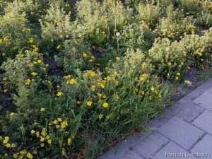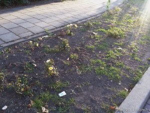 Met het ‘cultuurlijk’ groen is het minder goed gesteld. Het lijkt erop dat de gemeente uit bezuinigingsoogpunt de onderhoudsfrequentie neerwaarts heeft bijgesteld, zeker waar het de vakken met rozen en vaste planten betreft. Dit zijn nu juist vrij onderhoudsgevoelige planten, vooral als ze nog maar een paar jaar geleden zijn aangeplant. Het onkruid heeft vrij spel en torent boven de planten uit. Er ligt zwerfvuil. In een vak met rozen was vorig jaar zoveel aanplant doodgegaan dat er grote ‘gaten’ in zitten. Tot mijn verbazing worden deze niet opgevuld. Ik vind het allemaal een vrij treurige aanblik, zie de foto’s.