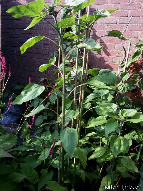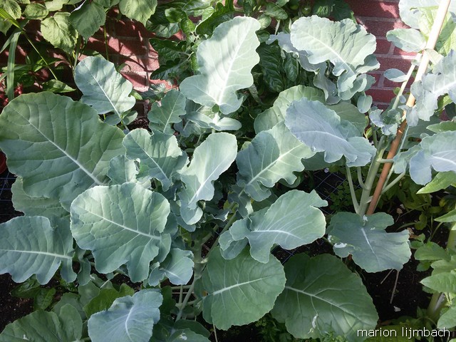 De minimoestuin. Ik heb natuurlijk alles veel te dicht op elkaar geplant. Inmiddels vechten de tomatenplant, artisjok en broccoliplanten (ik wist niet dat die zo groot werden!) om een plekje. De twee courgetteplanten zitten elkaar in de weg en de komkommerplant bokst op tegen de sneller groeiende zonnebloemen.