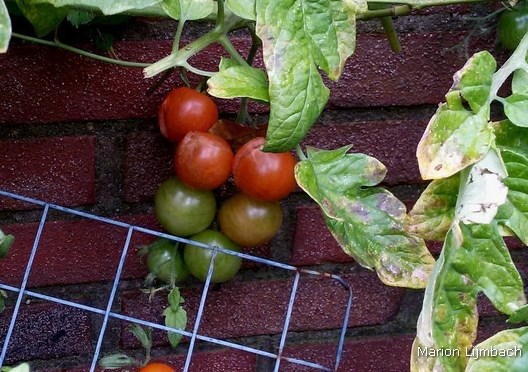Ik heb daarom alle hele, enigszins verkleurende exemplaren geplukt en binnen op de vensterbank gelegd, in de hoop dat ze nog rood worden. De geknapte zijn voor de hond, die is er gek op. De tomatenoogst is goed, trouwens, en de tomaten zijn prima van smaak.