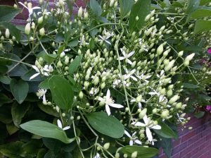 Op nummer 3 de clematis terniflora, de bosrank. Toen wij ons huis 9 jaar geleden kochten stond hij al tegen de garagemuur. Een geweldige clematis soort, afkomstig uit Japan, met een zee aan kleine witte (geurende!) bloemen, waar bijen gek op zijn. En hij bloeit vanaf september tot in november. Een geweldige aanwinst voor de tuin in de herfstmaanden.