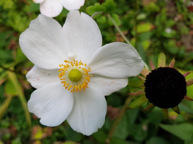 Op nummer 2 de herfstanemoon. De witte, want die steekt zo mooi af tegen de donker groene bladeren van de hedera. De bloemen zijn net spiegeleitjes. In de wind dansen ze aan de lange dunne stengels. De spierwitte bloemblaadjes lijken haast licht te geven als het gaat schemeren. Heel mooi.